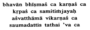 8. Thyself and Bhishma, and Karna, and also Kripa, the victor in war, Asvatthaman and Vikarna, and also Jayadratha,, the son of Somadatta ;