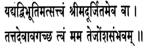 41. Believe that whatever thing in this world is endowed with Vibhooti (glory), Sri (prosperity); Utsaaha (enthusiasm), they are all born out of a part of My Tejas (splendour).