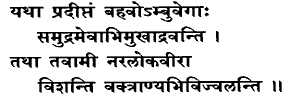29. As moths hurriedly rush into a blazing fire for destruction, just so do these creatures also hurriedly rush into Thy mouths for destruction. The splendour of the Universal Form.