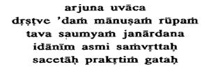 51. Arjuna said.Having seen Thy gentle human form, O Janardana now I have grown serene, and returned to my nature. Devotion as the sole means to the realization of the Universal form. The Blessed Lord said:
