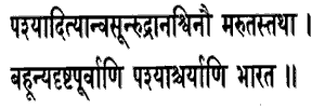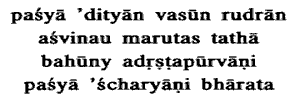 6. Behold the Adityas, the Vasus, the Rudras, the Asvins, and also the Maruts ; behold many marvels never seen before, O Bharata, Behold the twelve Adityas, the eight Vasus, the eleven Rudras, the two Asvins, the seven heptads of Maruts. Behold also many other marvels never seen before by you or anybody else in this world of man. Not this alone: