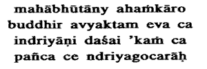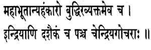 5. The Great Elements, Egoism, Reason, as also the Unmanifested, the ten senses and one, and the five objects of the senses ;The great Elements (Mahabhutas) are so called because they pervade all vikaras, all modifications of matter. The elements here referred to are the subtle ones (sukshma), not the gross (sthula) elements, which latter will be spoken of as the objects of the senses:Egoism (Ahamkara): selfconsciousness, consciousness of ego, the cause of the Great Elements. Reason (Buddhi) is defined by determination and is the cause of Ahamkara. The cause of Reason (Buddhi) is the Avyakta, the Unmanifested, the Avyakrita or Undifferentiated, the Energy of the Lord IsvaraSakti) spoken of in vii. 14. So much alone is Prakriti, divided eightfold. The ten senses are made up of the five buddhiindriyas , senses of knowledgesuch as hearing; so called because they produce knowledge, and of the five karma indriyas, senses of action such as speech and hand, so called because they bring about action. And the one: the manas, which is composed of thoughts and purposes (samkalpa) and so on, is the eleventh sense. The five objects of the senses are sound, etc. The Sankhyas speak of these as the twentyfour principles (tattvas).