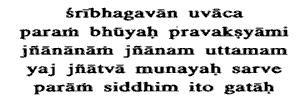 1. It has been said that all that is born is produced by the conjunction of Kshetra and Kshetrajna.How can it be so ? The present discourse is intended as an answer to this question.Or the connection may be explained thus: With a view to show that it is Kshetra and Kshetrajna, both dependent on the Isvara,but not independent in themselves as the Sankhyas hold,that constitute the cause of the universe, it has been stated that the dwelling (of the Kshetrajna) in the Kshetra (i.e his selfidentification with Kshetra) and his attachment for the Gunas from the cause of samsara (xiii. 21.)In what Gunas and in what way is He attached ? What are the Gunas ? How do they bind him How is liberation from the Gunas attained ? What are the characteristics of a liberated soul ?With a view to answer these questions, the Lord proceeds as follows: knowledge of the origin of the universe is necessary for Salvation. The Blessed Lord said: I shall again declare that sublime knowledge, the best of all knowledge's ; which having learnt, all the sages have passed to high perfection from here.Though declared more than once in the preceding discourses, I shall again declare that knowledge which is sublime as concerning itself with the Supreme Being. and which is the best of all knowledge's as productive of the best result All knowledge does not refer to those which have been spoken of as knowledge in the verses xi. 710 but to those kinds of knowledge which relate to sacrifices and other such things to be known. These (latter kinds of knowledge) do not lead to salvation, whereas the knowledge which is going to be imparted in this discourse does lead to salvation. So, the Lord praises this latter knowledge by the epithets sublime and best, in order to rouse interest in the minds of the hearers.