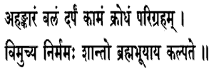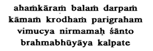 53· Having abandoned egotism, strength,. arrogance, desire, enmity, property, free from the notion of , mine, and peaceful, he is fit fox be coming Brahman. Egotism ; identifying the Self with the body, etc. strength: that strength which is combined with passion and desire, but not the physical or any other strength: the latter being natural, its abandonment is not possible. Arrogance: which follows the state of exultation and leads to the transgression of dharma, as said in the smriti:When a man exults, he becomes arrogant, and when he becomes arrogant, he transgresses dharma Property: though a man is free from all passions of the mind and the senses, he may own so much of external belongings as is necessary for bodily sustenance and for the observance of his duties (dharma) ; but even this the aspirant abandons ; i,e he becomes a ParamahamsaParivrajaka, a samnyasin of the fourth or highest order. He does not regard even the bodily life as his. Peaceful: free from exultation and care. Such a devotee of wisdom is fit to become Brahman. The consummation of knowledge attained by Devotion. In this is way,