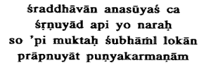 71. One who listens to this dialogue without any hatred towards Me and with faith, he also will be liberated and will attain heavenly abodes.