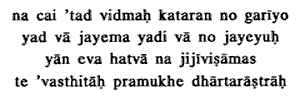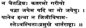 6. and we know not which is the better alternative for us ; nor do we know whether we shall conquer them or they will conquer us. Even the sons of Dhritarashira, after killing whom we do not wish to live, stand arrayed against us.