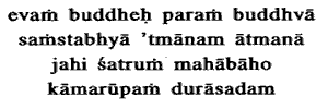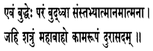 43· Then knowing Him who is superior to reason, subduing the self by the self, slay thou, O mightyarmed, the enemy in the form of desire, hard to conquer.Thus understanding the Self who is superior to reason, and subduing the self by the elf, i.e steadily composing the self by means of the self do thou slay desire. It is difficult to conquer desire, on account of its complex and incomprehensible nature.