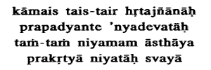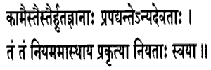 20. Those whose wisdom has been led away by this or that desire resort to other Gods, engaged in this or that rite, constrained by their own nature.Their desires for progeny, cattle, svarga and the like deprive them of their power of discrimination, and they resort to other Gods (Devatas), other than Vasudeva, the Self. They engage in rites peculiar to the worship of these Gods ; they being constrained to do so by their own nature (prakriti), by that peculiar tendency (samskara) which they acquired in the previous births. Of these lustful men,