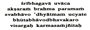 3. Brahman is the Imperishable (Akshara), the Supreme. The Ego is said to be the Individual Self (Adhyatma), He who dwells in the body), The offering which causes the origin of physical beings is called action (Karma). Brahman is the Akshara, the Imperishable, the Supreme Self (Paramatman) ; the sruti says O Gargi, it is at the command of this Akshara, the imperishable Paramatman, that heaven and earth remain, held in their places. Akshara does not here mean the syllable Om ; for, the latter is subsequently specified thus: Uttering the syllable Om, the Brahman (viii. 13). And the epithet supreme applies better to Brahman, the Imperishable, who transcends all, (than to the syllable Om ).The same Supreme Brahman existing as the Ego, as the Innermost Self, as the Pratyagatman, in every individual body, is said to be Adhyatma: that which first shows itself as the Innermost Self in the body and turns out in the end to be identical with the Supreme Reality, the Brahman, is known by the term Adhyatma. The sacrificial act which consists in offering cooked rice, cakes sod the like to the Gods (Devatas)· and which causes the origin of all creatures, is known by the term Karma ; for, it forms the seed as it were of all beings ; it is in virtue of this act that all beings, animate and inanimate, come into existence, after passing through rain and other regions of life