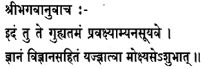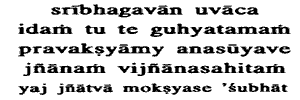 1. The Blessed Lord said:To thee who dost not cavil, I shall now declare this, the greatest secret, knowledge combined with experience, which having known thou shall be liberated from evil.This: the BrahmaJnana, the, knowledge of Brahman, which is going to be declared, and which has been declared in the preceding discourses. Now: this word points to the superiority of knowledge (over Dhyana): this right knowledge alone forms the direct means of attaining moksha; as declared in the sruti and the smriti: Vasudeva is the All (Bhagavadgita, v. 19.) And nothing else is a direct means to moksha, as the passages of the sruti like the following declare:Now the other princes who understand otherwise than thus, they shall attain to perishable regions. On attaining this knowledge you will be liberated from the bondage of samsara. And it is