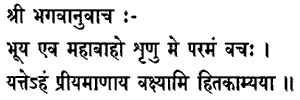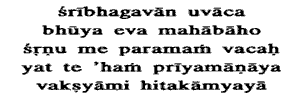 1. The Blessed Lord said:Again, O mightyarmed, listen to My Supreme word, which I, from a desire for thy wellbeing, shall speak to thee who art delighted. Supreme: as revealing the unsurpassed Thing. Delighted you are intensely delighted with My speech, as though you are drinking the immortal nectar.Why should He speak of it The Lord says: