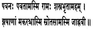 31· Of purifiers I am the wind, Rama of warriors am I, of fishes I am the shark, of streams am the Ganges.Of those who bear weapons I am Rama, Dasarathas son