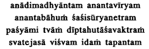 19. I see Thee without beginning, middle or end, infinite in power, of manifold arms ; the sun and the moon being Thy eyes, the burning fire Thy face ; heating the whole Universe with Thy radiance.