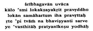 32. I am the mighty worlddestroying Time, now engaged in destroying the worlds, Even without thee, none of the warriors arrayed in hostile armies shalt live. Warriors: Bhishma, Drona, Karna and others.Such being the case.