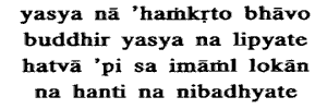 17. He who is free from egotistic notion, whose mind is not tainted,though he kills these creatures, he kills not, he is not bound.He whose mind has been well trained in the scriptures, selftrained by a masters instructions, and welltrained in the sound principles of reasoning, is free from the egotistic notion that I am the agent. He thinks thus: It is these fivethe body, etc ascribed to the Self through avidya that are the causes of all action, not I. I am the witness of their actions. I am without breath, without mind, pure, higher than the Indestructible which is Supreme (Murtd. Up. 21· 2). I am pure and immutable. He whose antahkaraysa (buddhi), which is an upadhi of the Self, is not tainted, does not repent thus: I have done this: thereby I shall go to naraka (hell). He is wise: he sees rightly: though he kills all these living creatures, he commits no act of killing nor is he bound by the fruit of adharma as an effect of that act.(Objection):Even supposing that this is intended as a the statement that though he kills all these mere raise, creatures, he does not kilt involves a selfcontradiction.(Answer):This objection cannot stand ; for, the statement can be explained by distinguishing the two standpoints of worldly conception and absolute truth From the stand point of worldly conception, which consists in thinking I am the killer by identifying the Self with the physical body etc the I Lord says, though he kills; and from the standpoint of absolute truth explained above, He says. be kills not, he is not bound.